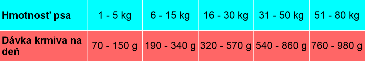 ODPORÚČANÁ DENNÁ DÁVKA: Denná potreba sa môže líšiť v závislosti od fyzickej aktivity a veku psa. Odporúčame rozdeliť dennú dávku do dvoch kŕmení.