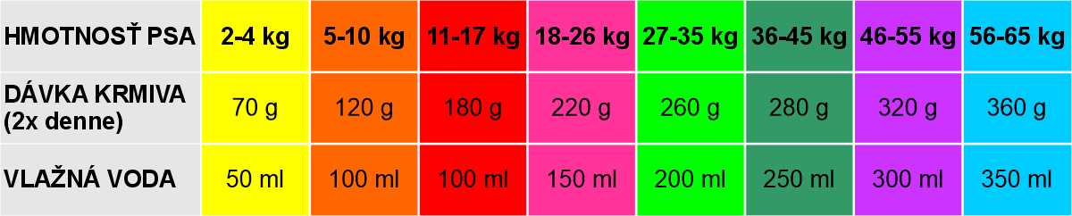 Uvedenú dávku krmiva podávajte 2x denne. Krmivo premiešajte s vlažnou vodou a podávajte po 2-3 minútach! Zabezpečte prístup k čerstvej, čistej vode.