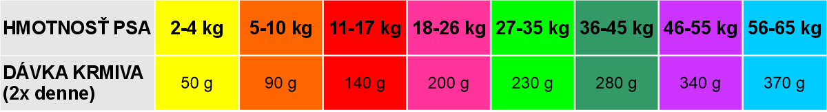 Uvedenú dávku krmiva podávajte 2x denne. Zabezpečte prístup k čerstvej, čistej vode.